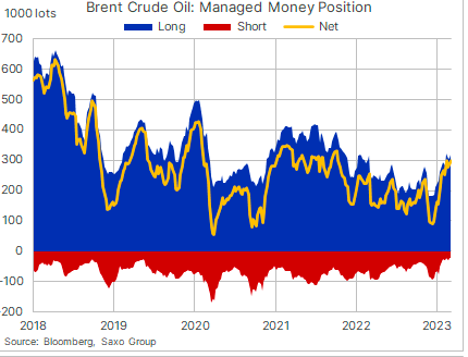 Brent Oil has fallen > 50% since last year, and bulls still hold on. COT on energy in wk to March 7 showed length held near a 17 month high at 298k lots with the long/short ratio at 14.5 not being this stretched since May 2019. False hopes?