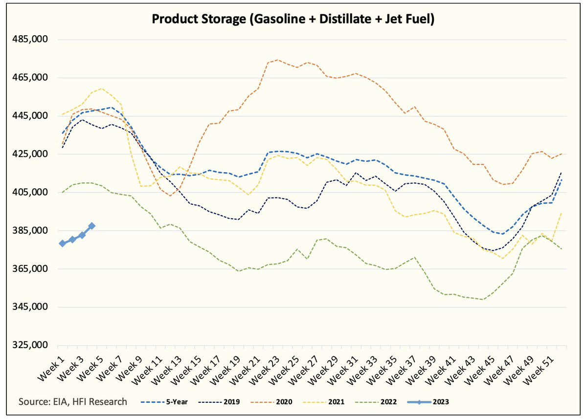 Remember how the Oil Bulls kept saying all of 2H’22 that inventories were super low and “running out”. Sure as we said they were low, but it was never about where they came from, but WHERE THEY WERE GOING! As you can see, products are NOW BUILDING, it is the rate of change that is important, not the levels. So the only two things bulls hold onto was 1) Chinese demand magically returning 2 mbpd of Oil demand and 2) Russian product bans means the world will have a product shortage.