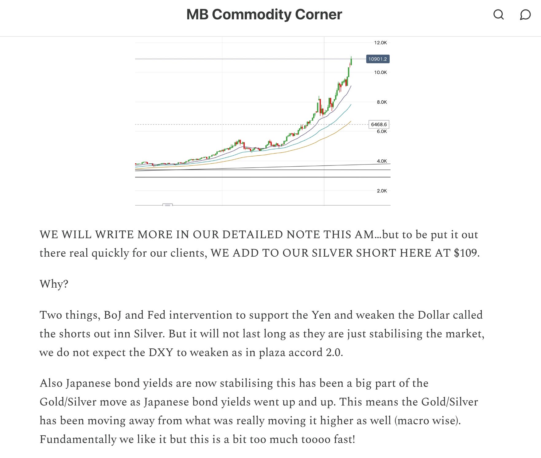 On 26th Jan, MBCC wrote about why we were fading the SILVER MOVE and initiated a SHORT at $109, snapshot of our note out of paywall below. When sell side was pushing Silver buy at $120…it crashed 40%+!
