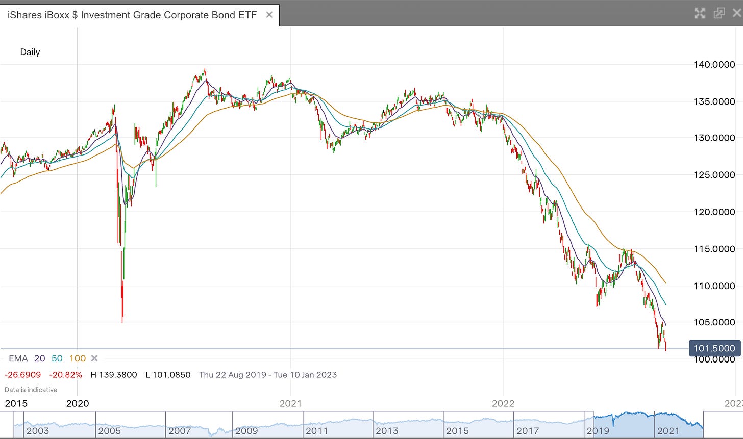 The most worrying thing in the market right now is US Corporate and High Yield Bond market along with Treasury Bonds. The chart shows the $LQD, Investment Grade Corporate Bonds, and how they have been clobbered and are trading down to below whether the Fed first bought them during the 2020 covid crisis.