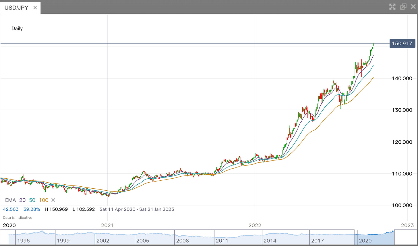 Do you think this looks normal? Everyone is obsessed with quoting valuations and seasonality blah blah. The FX and Bond markets are broken. The Yen trading > 150 implies the Bank of Japan has lost it, they can either control their Bond market or their currency, not both! The lid has been blown away. They have no choice and need to sell to raise funds, hence US Bond market is collapsing. Look at US 10 year yields trading at 4.30%……stay tuned…
