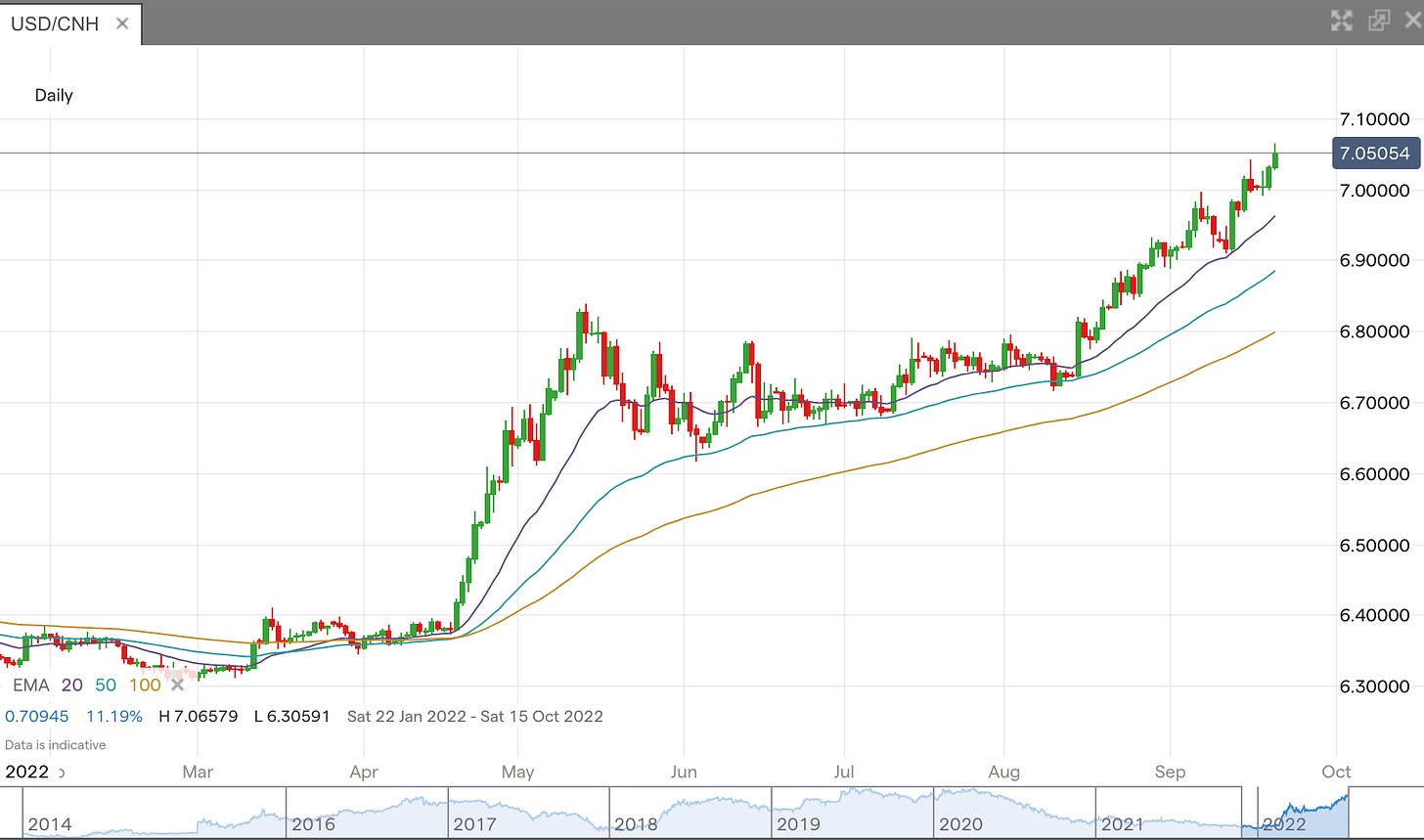 As we head into the Fed FOMC this evening, consensus expects 75 bps rate increase, but just 2 analysts expecting a 100 bps move. With all the talk on the Fed and the Dollar, the Chinese Yuan has recently made its move way past the magical 7 number and falling.